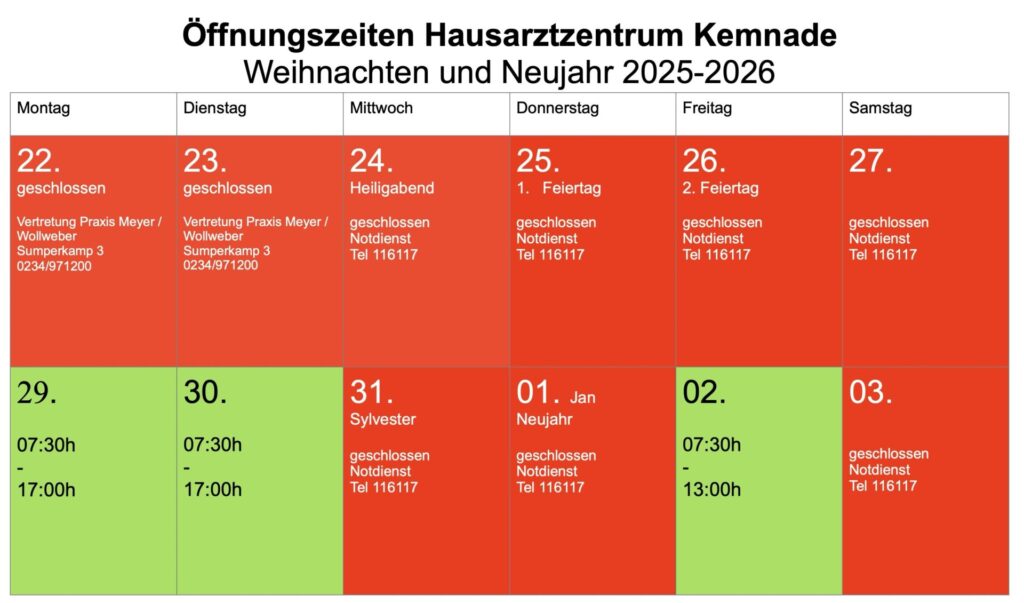 Das Hausarztzentrum ist in der Weihnachtswoche geschlossen! Die Vertretung am 22. und 23.12.25 übernimmt die Praxis Meyer/Wollweber, Sumperkamp 3, Bochum 0234 – 971200. An den anderen Tagen Wengen Sieges an den ärztlichen 24h-Notdienst Tel: 116117 (ohne Vorwahl) oder die Notdienstpraxis im St. Josef Hospital, Gudrunstraße/Bochum.
